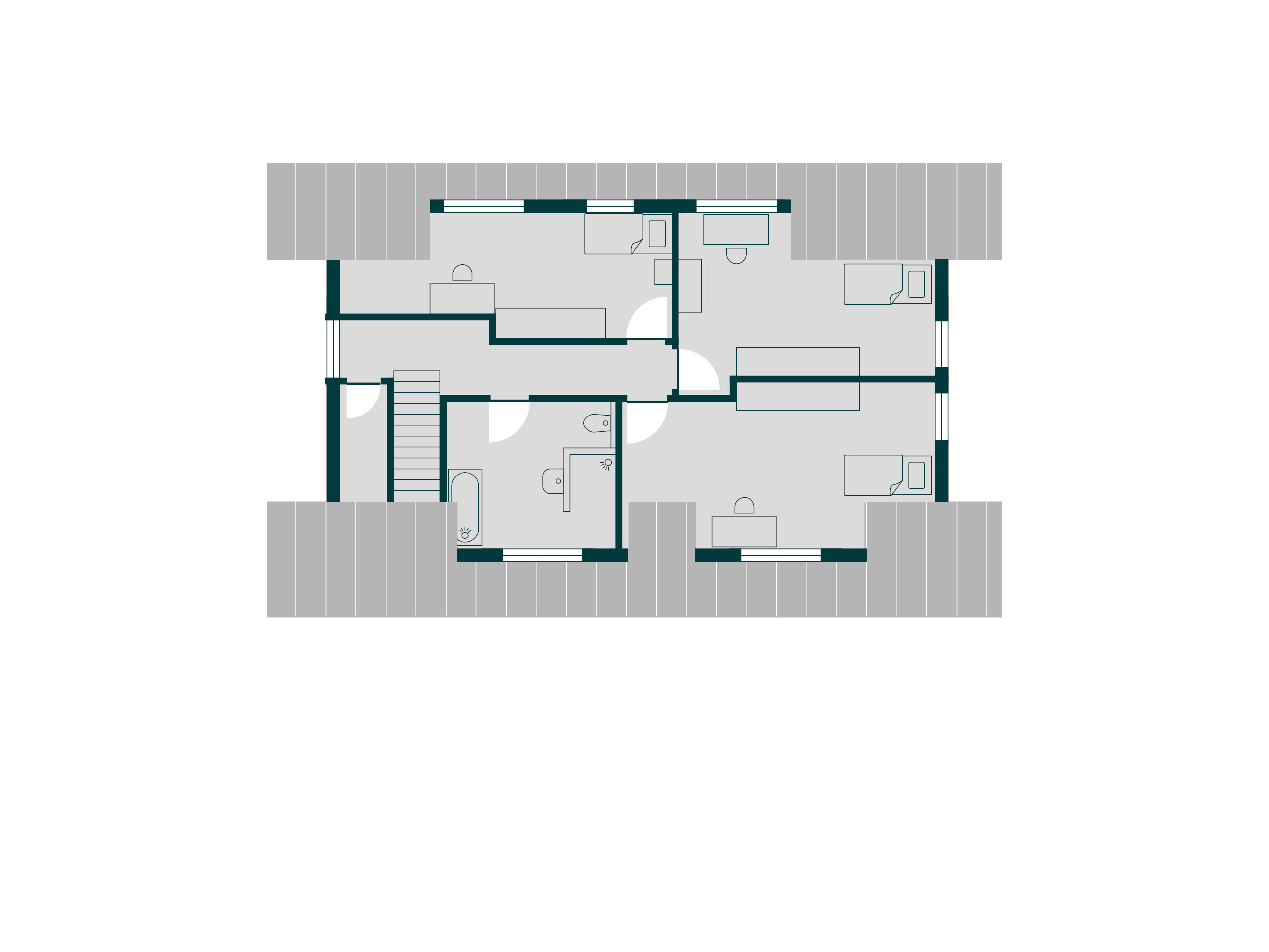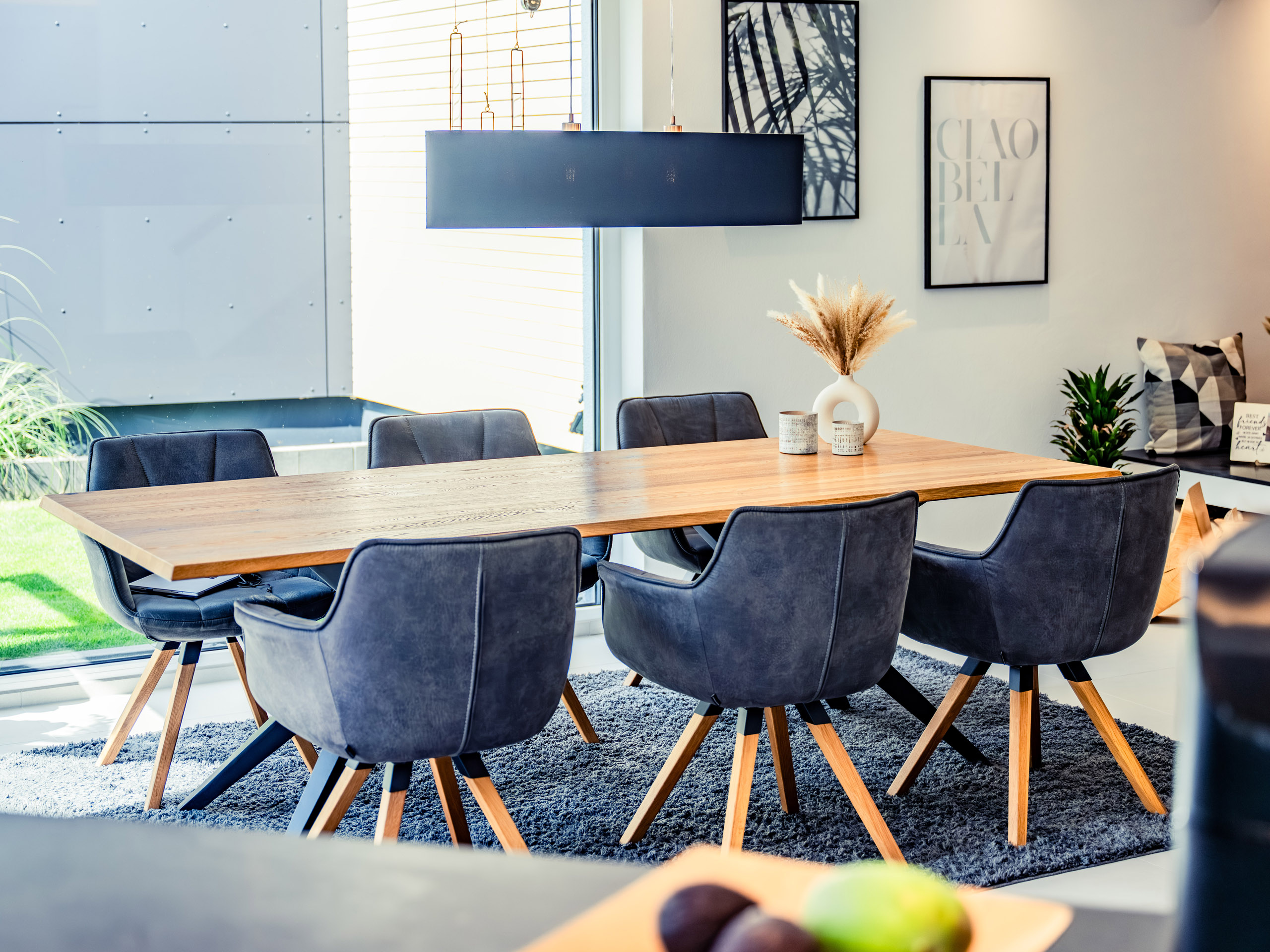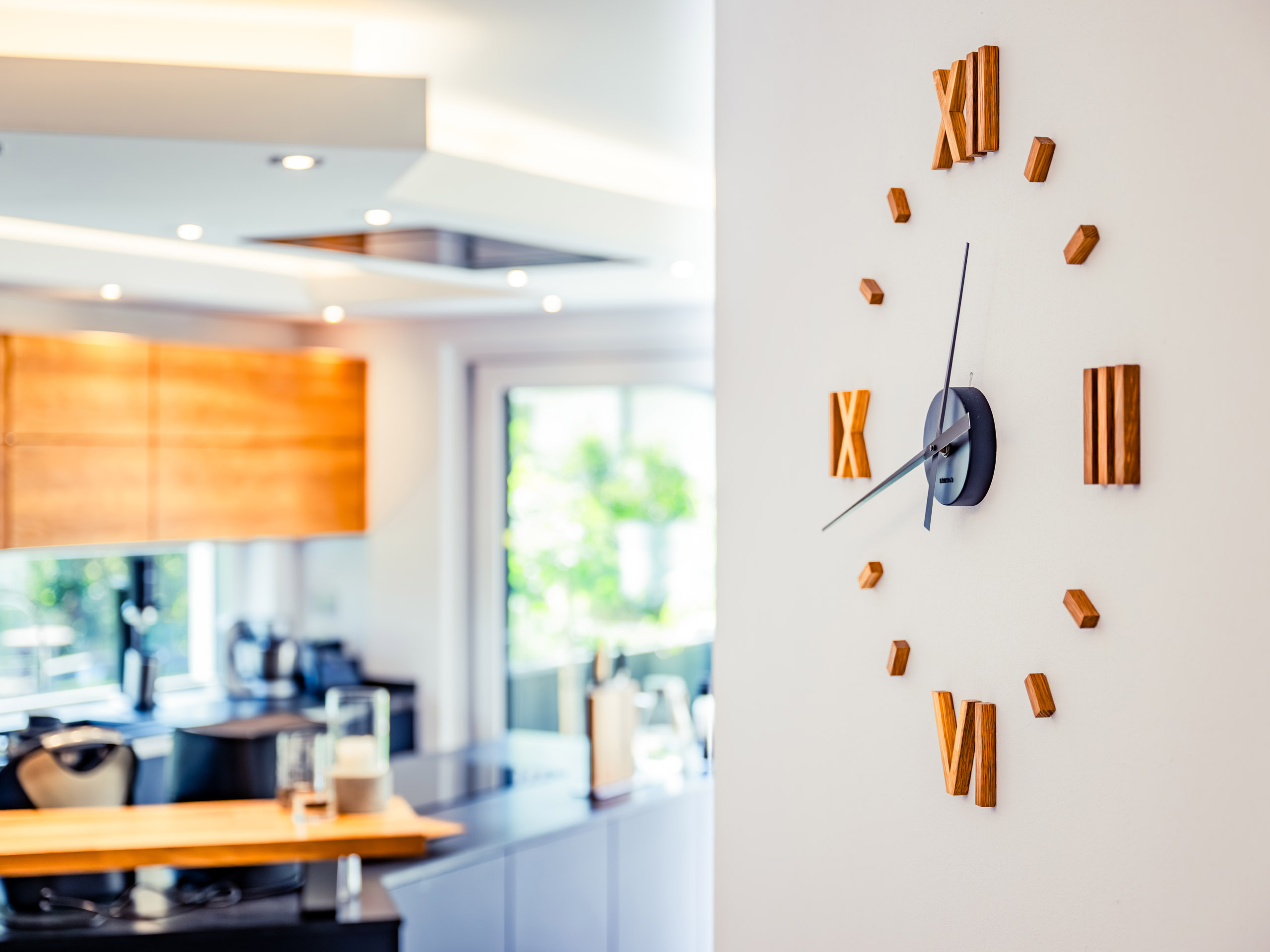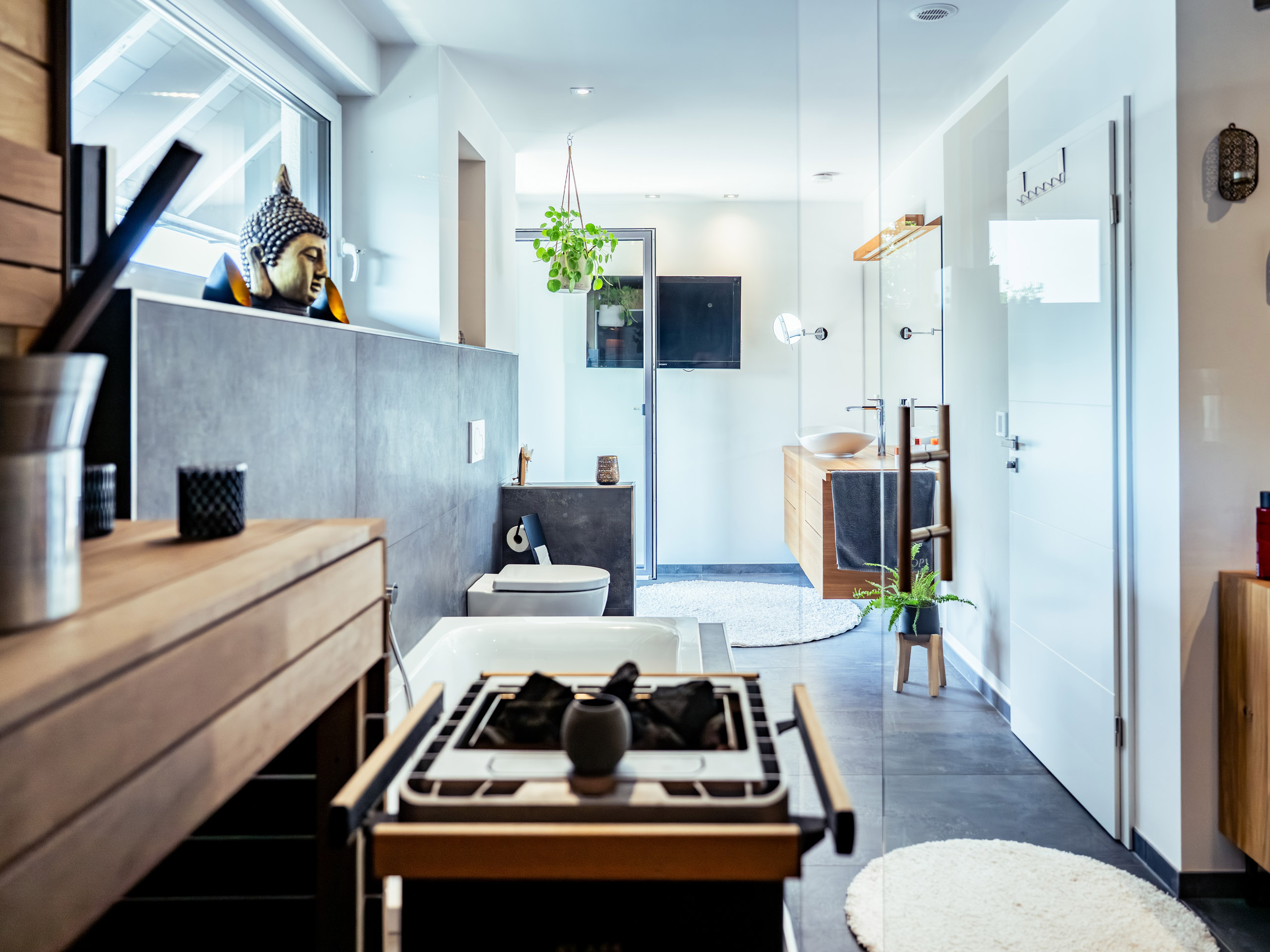 Die starke Hanglage dieses Einfamilienhauses ist – wenn auch planerisch zunächst herausfordernd – zum einzigartigen Vorteil geworden: Es gelang unter anderem durch den umlaufenden Balkon und die zweite Zugangstür auf dem oberen Grundstück, das Wohngefühl von zwei gleichwertigen Erdgeschossen zu erzeugen. Da das Grundstück von unten erschlossen werden musste, war es den Bauleuten besonders wichtig, dass sich die Garage auf derselben Höhe wie die Hauptzugangstür befindet. So werden Wege kürzer und der Wohnalltag noch komfortabler.
