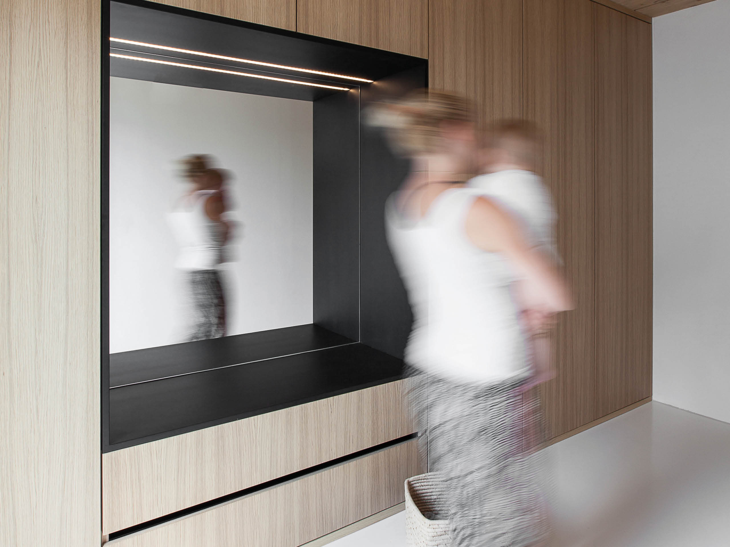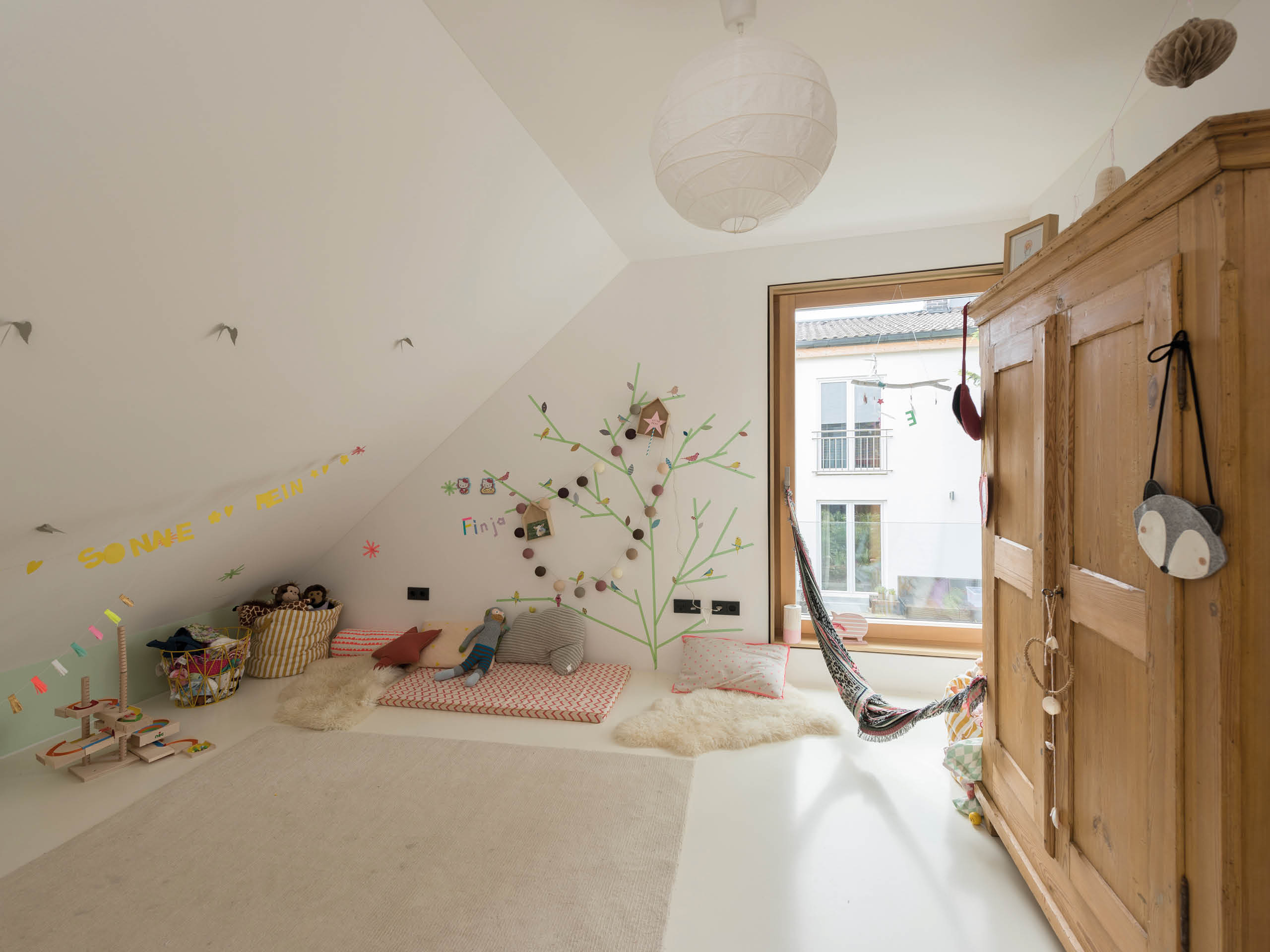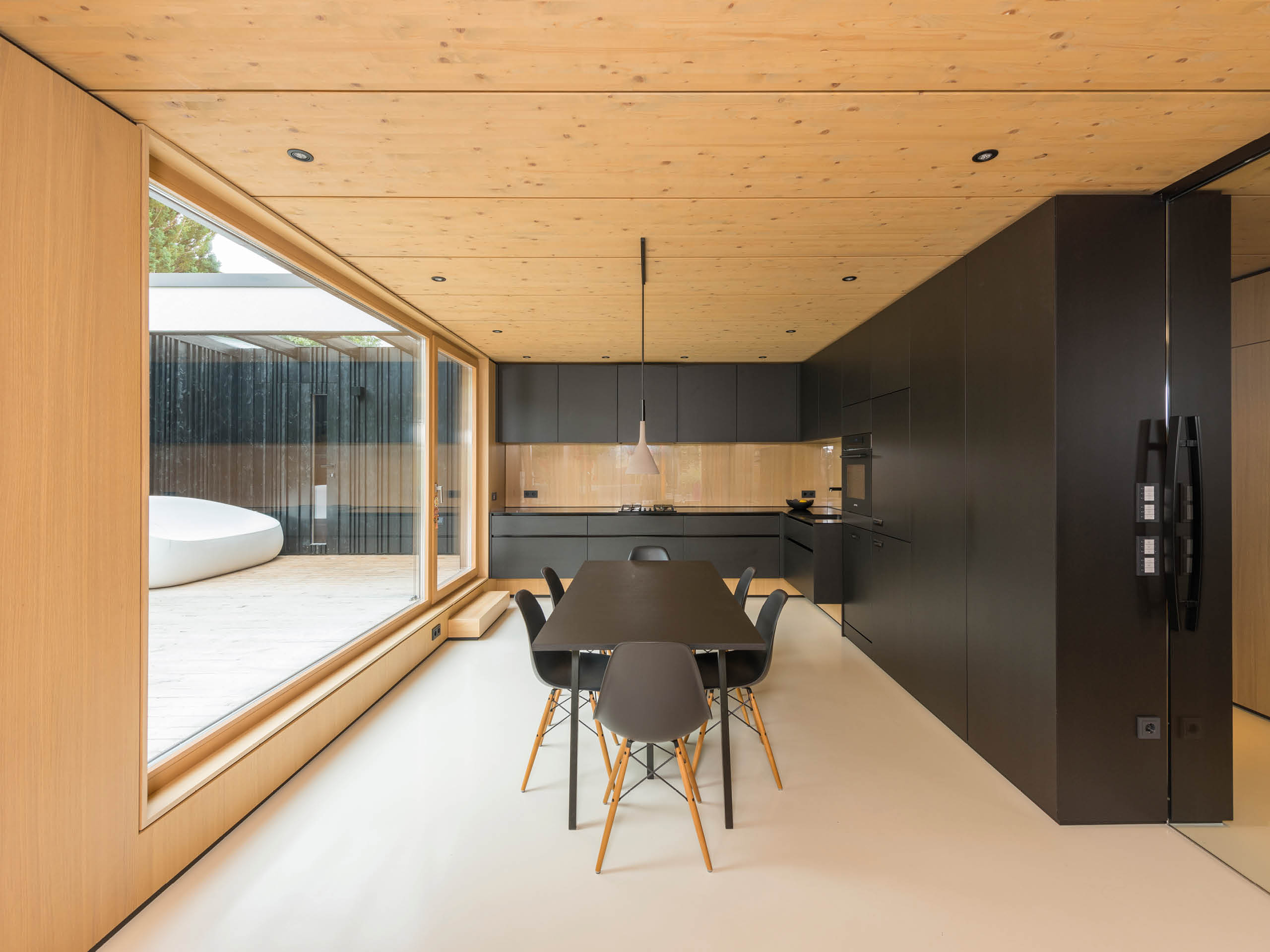 Während die Lochfassade zur Straße hin für einen optimalen Schallschutz nur sparsam unterbrochen wird, öffnet sie sich auf der Rückseite mit einer üppigen Übereckverglasung zum Garten hin. Im Inneren begegnet die Klarheit klassischer japanischer Architektur der Behaglichkeit warmer Naturtöne. Schranktüren verschwinden grifflos in der Fläche und passen sich so dem minimalistischen Lebensstil der Baufamilie an. Trotz der Grundstücksknappheit in der Region kann Familie Brandt maximalen Wohnkomfort genießen – denn wie Christoph Brandt schnell erkannte, liefert eine schlanke Holzkonstruktion bei gleichem Dämmwert deutlich mehr Wohnfläche als ein Mauerwerk plus Zusatzdämmung.