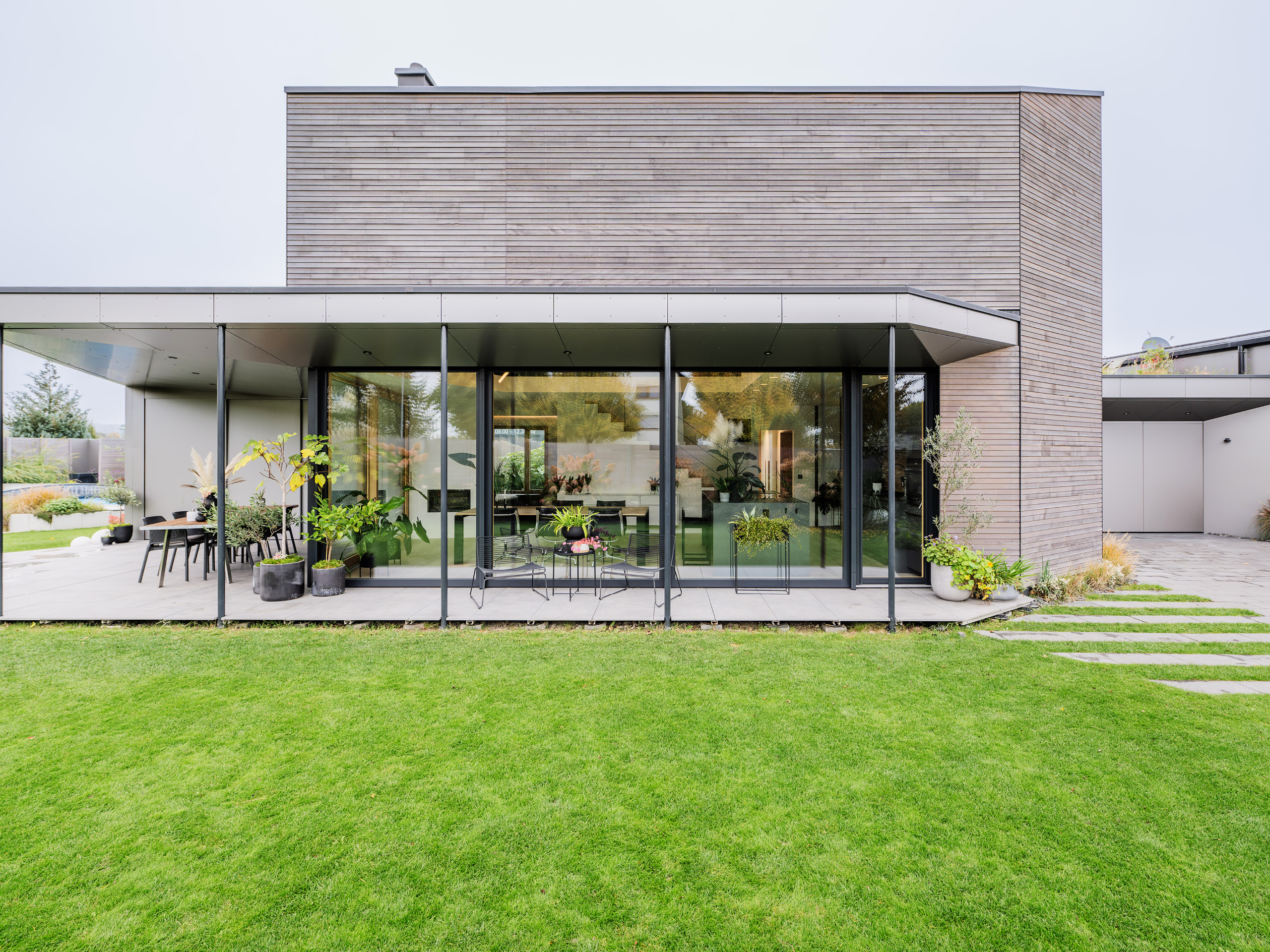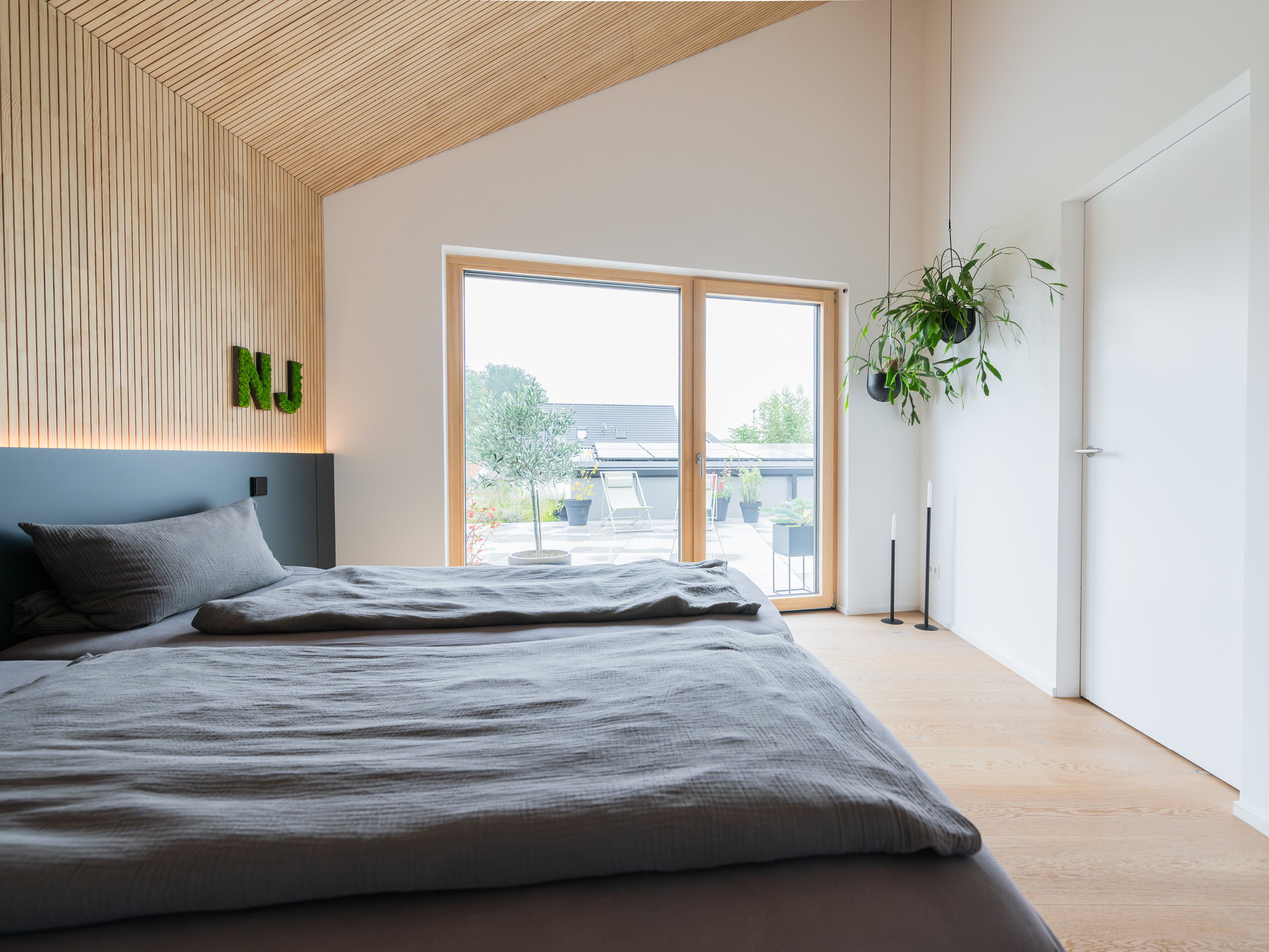 Ansonsten ist das Haus energetisch auf dem aktuell besten Stand: Mit den Tiefenbohrungen wird das Haus mit Erdwärme über eine Wärmepumpe versorgt. Die PV-Anlage mit Batteriespeicher und intelligenter Steuerung wandelt den Energieüberschuss in Warmwasser um. „Somit hat man verschwindend geringe Unterhaltskosten für das Haus und man kann trotzdem noch zwei E-Autos laden“, freut sich der Bauherr.