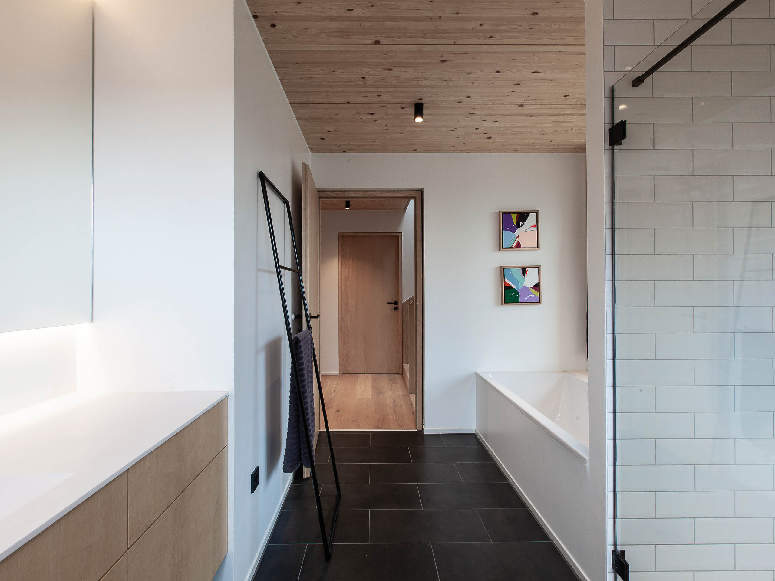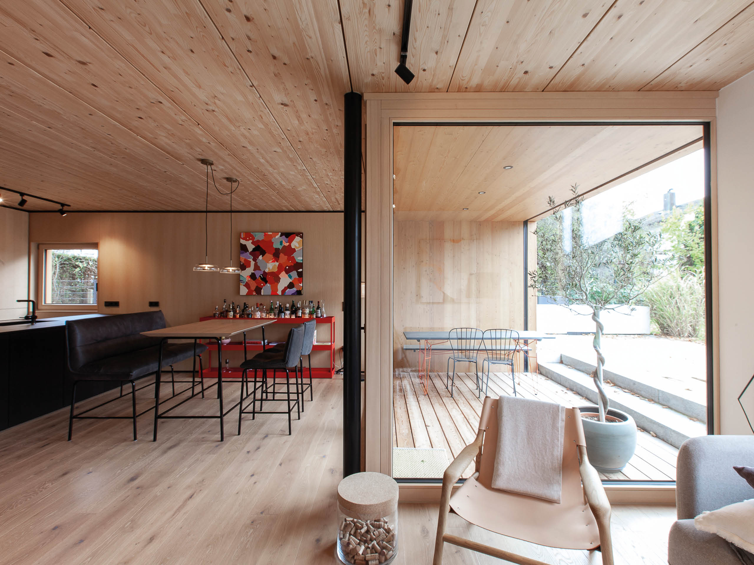 Schlicht und schwarz sollte es sein, da waren sich die Familien einig. Helle Lärchenfenster ergänzen dabei die dunklen Fassaden. Dieser Kontrast wurde im Inneren gekonnt umgekehrt, wo dunkle Flächen Akzente im ansonsten naturfarbenen Interieur bilden. Die Funktionsbereiche gliedern sich in Essbereich und Küche im Erdgeschoss, Schlafplätze im Obergeschoss und Arbeits- und Hobbyräume im Dachgeschoss. Kein Wunder, dass die Baufamilien so zufrieden sind: „Unser Traum vom stilvollen Wohnensemble ist auf ganzer Linie wahr geworden.“