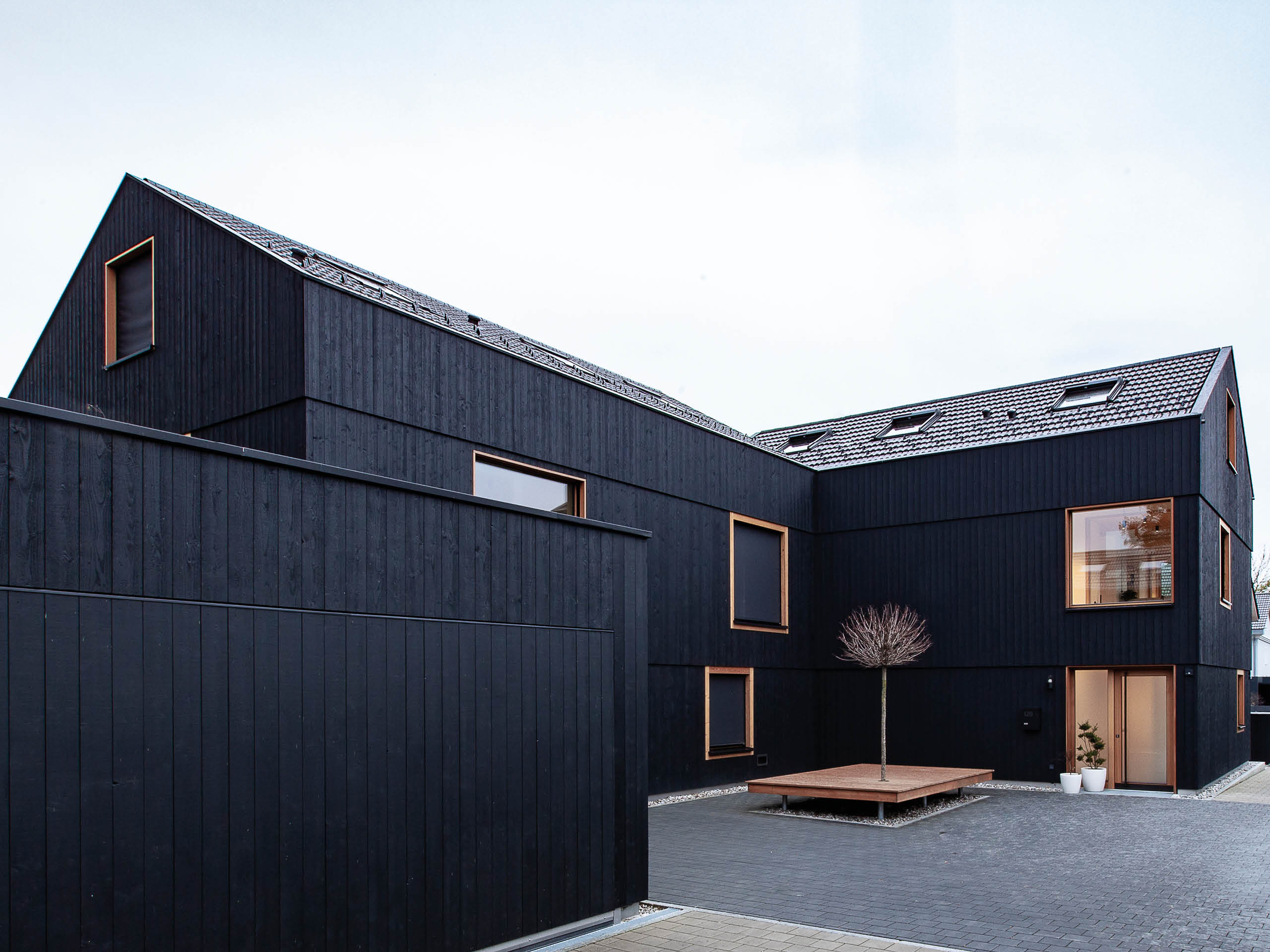 Bereits zum dritten Mal realisierte die insgesamt zwölfköpfige Bauherrschaft erfolgreich ein gemeinsames Projekt: Dabei entstanden inmitten der gewachsenen Siedlungsstruktur drei edel anmutende, kompakte Einfamilienhäuser mit Garagengebäude. Ein gemeinschaftlicher Innenhof verbindet die ansonsten getrennten Häuser und wird zum Dreh- und Angelpunkt für ein harmonisches Miteinander.